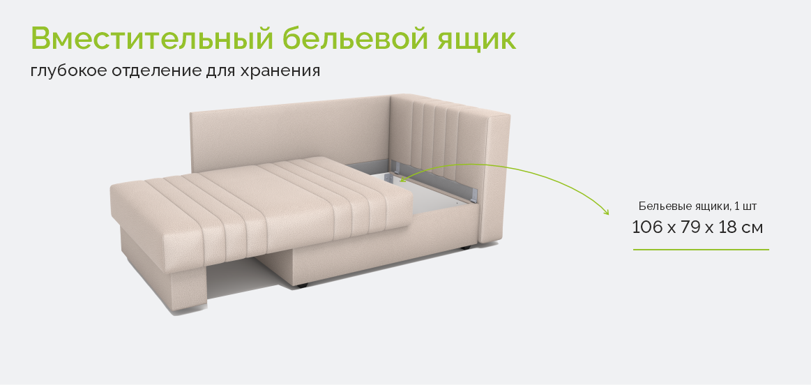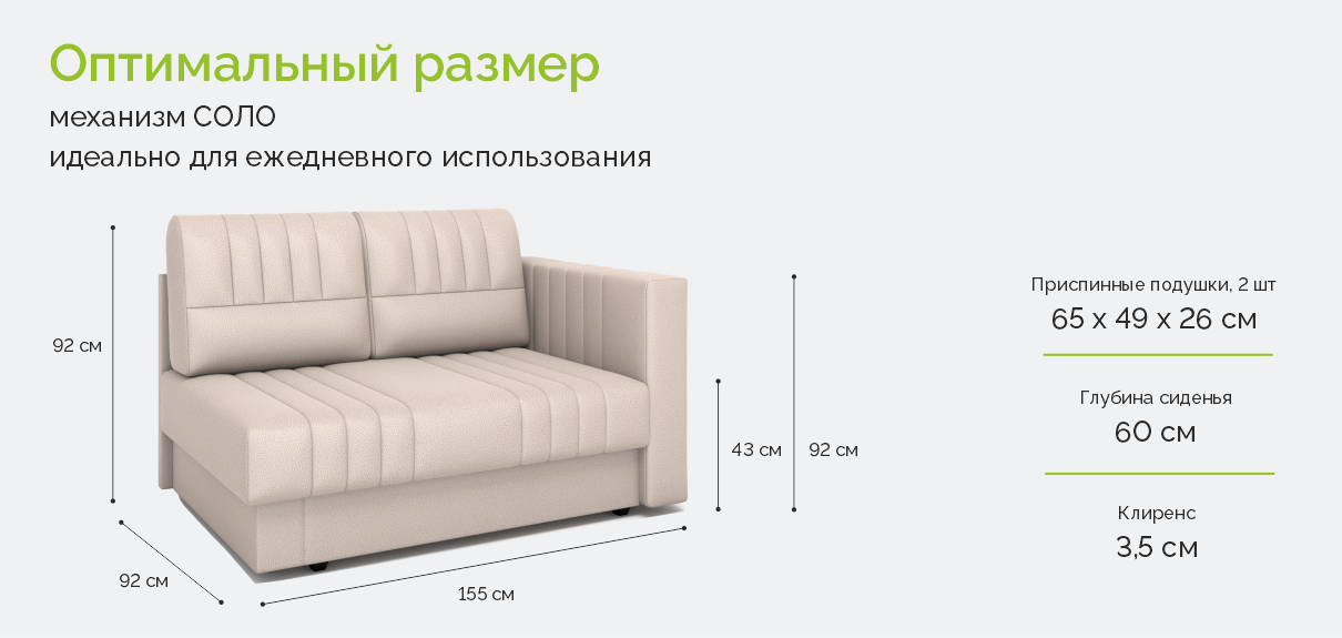 В основе модели — надежный механизм «соло». При необходимости кушетка легко и бесшумно раскладывается в сторону, превращаясь в комфортное односпальное место. Это идеальный вариант для дневного отдыха или сна одного человека, который не требует постоянной перепланировки комнаты.