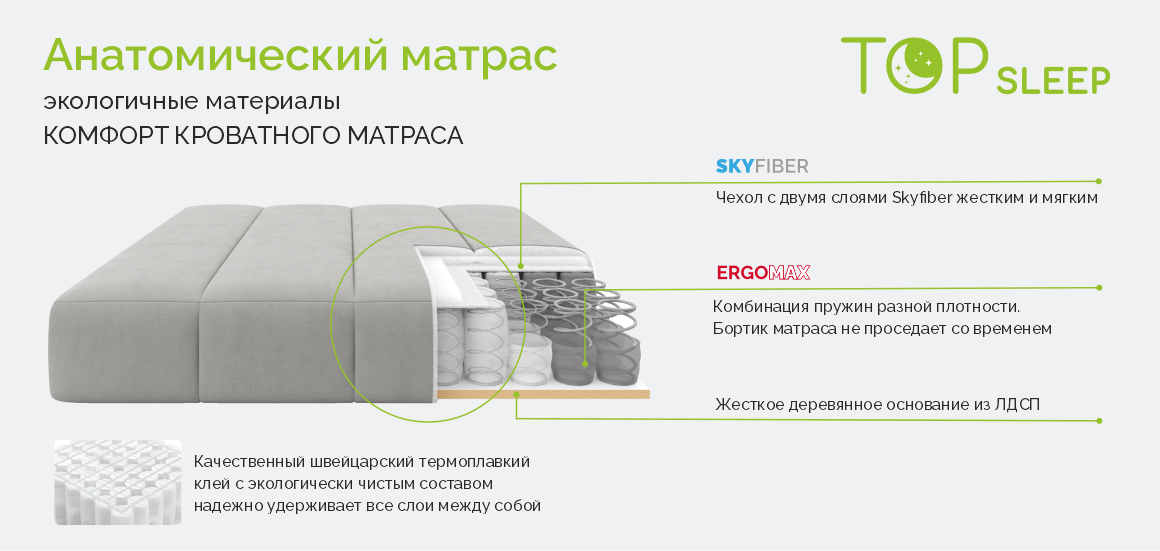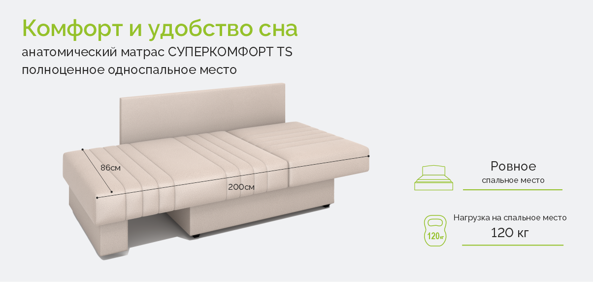 Несмотря на компактные размеры, внутри скрывается полноценный анатомический матрас Суперкомфорт TS. Его основа — блок независимых пружин, который точечно поддерживает тело во время сна. Инженерное решение с обкладкой пружин большей жесткости по периметру обеспечивает повышенную устойчивость конструкции — край матраса остается жестким и не проседает даже при длительной эксплуатации. Высота матраса 19 см дарит ощущение сна на профессиональной кровати.