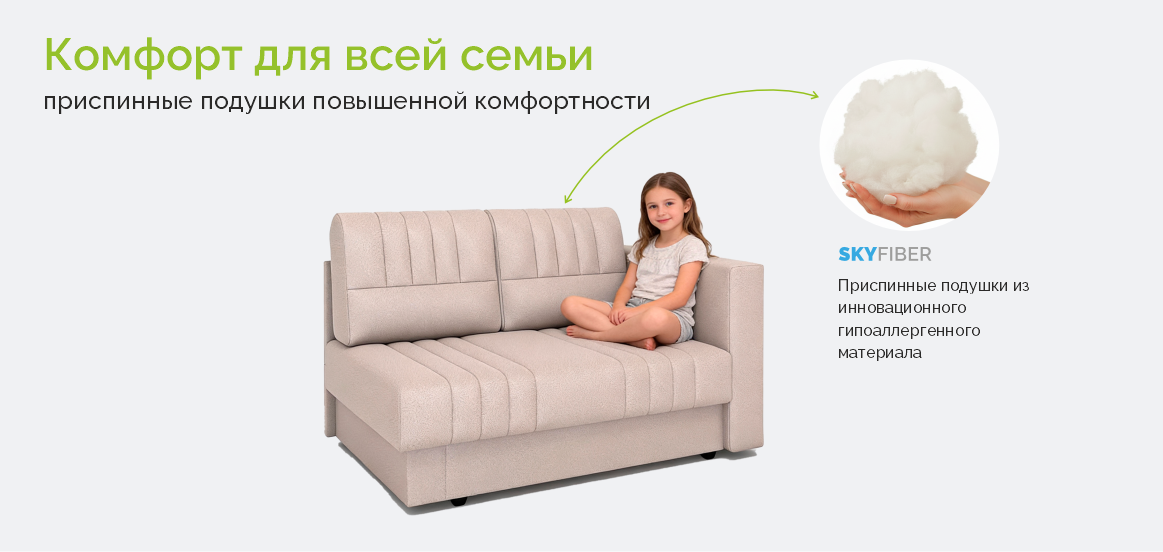 • Инновационный наполнитель: Приспинные подушки начинены материалом Skyfiber. Это гипоаллергенное, «дышащее» и упругое волокно. Оно не сминается со временем, не дает усадки и мгновенно возвращает форму после нагрузки.