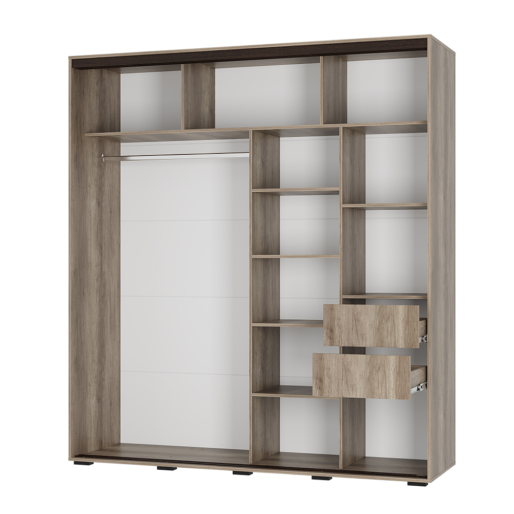 •  Продуманное хранение: Шкаф оснащен хромированной штангой, полками и ящиками на шариковых направляющих.