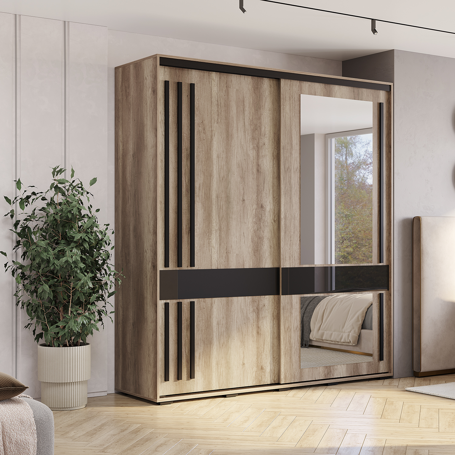 Шкаф-купе «Крафт-8» — идеальное сочетание натуральной древесной текстуры и элегантных черных акцентов. Этот шкаф станет центральным элементом интерьера, добавив ему тепла и современного шика.